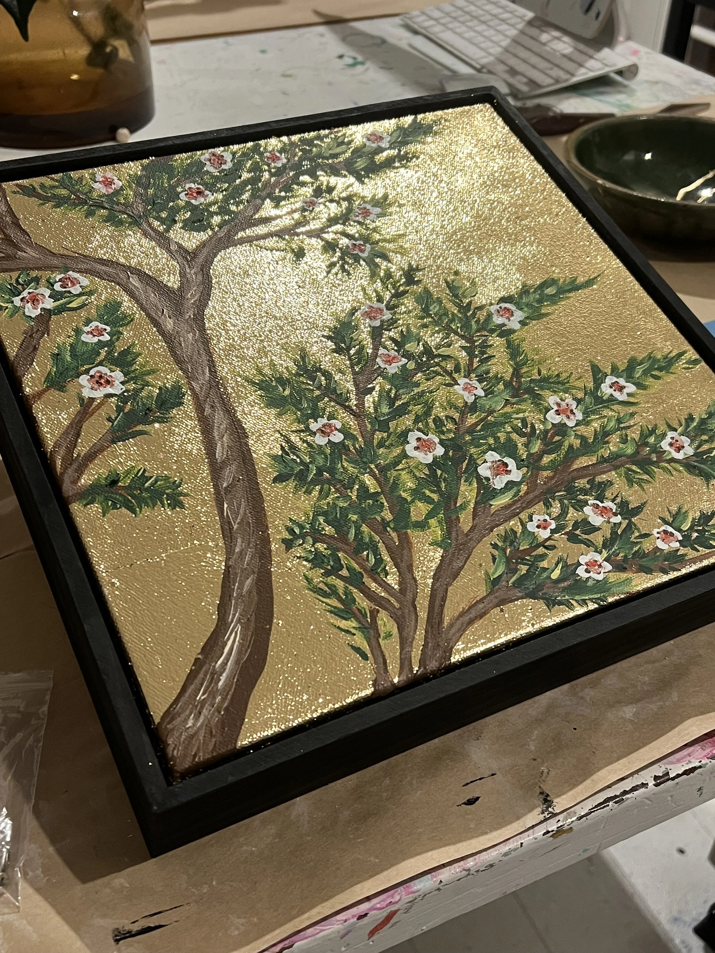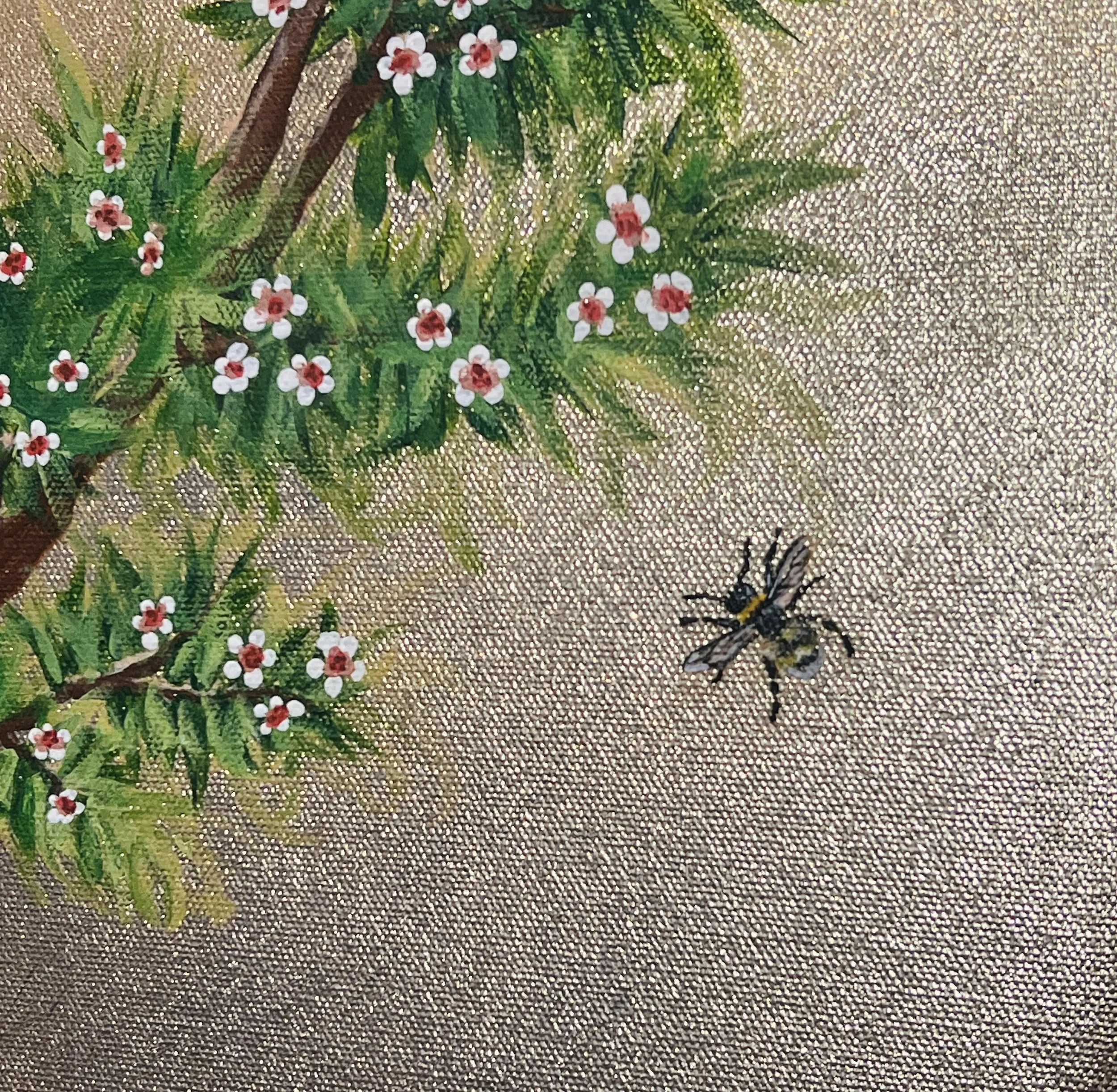 Finished works are then varnished and framed - I can add embellishments such as bees for this family of bee keepers who chose the Manuka as their family tree